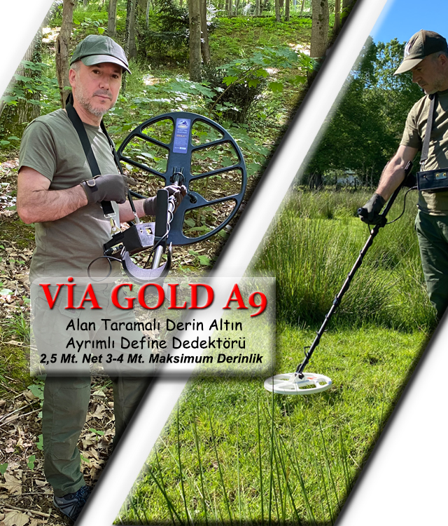 Via GOLD A9 altın arama dedektörü, 60×60 7 khz arama başlığı ile yer altındaki oda mezarlarını, tünel girişlerini, kaya içindeki büyük külçe altın ve hazineleri, define işareti yapılmış Ermeni, Rum hazine ve definelerini, Roma, Bizans, Greek altınlarını, gümüş, bronz, tunç, metal obje ve heykelleri 20 santim ile 3 metre derinden bulabilmektedir. Via Gold A9 alan tarama ve altın dedektörü, altınları, değerli objeleri ve hazineleri 2D canlı grafik tarama ve sayısal değer ekranındaki özel yazılım ve tasarımı sayesinde %60-70 arası garantili net ayrım yapabilmektedir. Via GOLD A9 Ekranlı Dedektör, değersiz metalleri %60-70 oranında değersiz olarak ayrım yapabilmektedir.