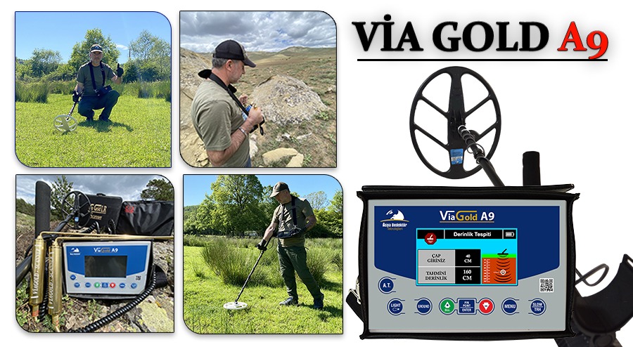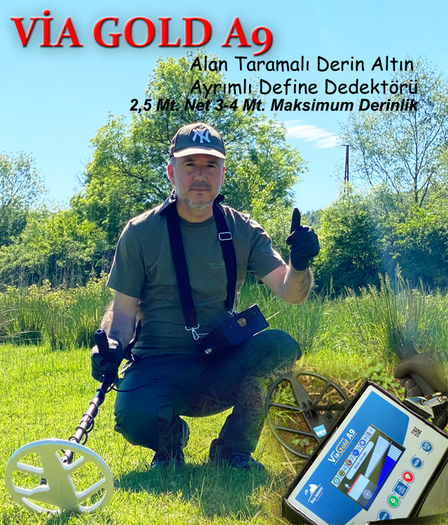 altını tarama imkânı sunmaktadır. Tarihi ören yerleri ve define işaretleri çevresinde, kazan, küpler içerisindeki hazineleri, altın, külçe, heykel, bilezik, tek para aramalarında Via GOLD A9 dedektör, otomatik arama sistemi ve otomatik toprak ayarı sayesinde tüm madenli toprak ve kayalarda %95 tespit gücü sunmaktadır.