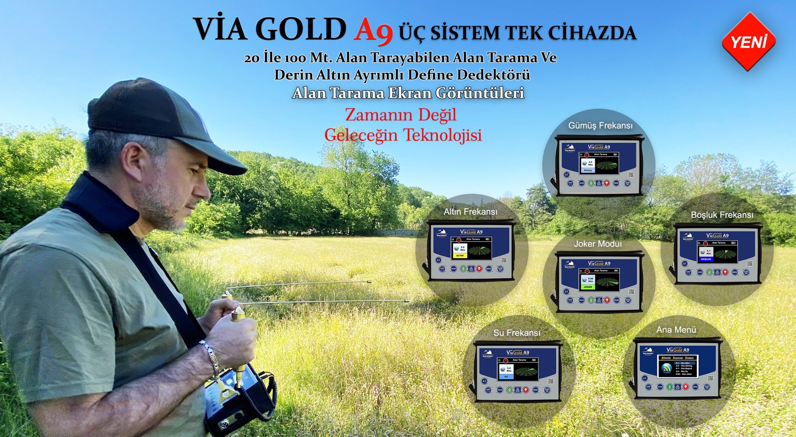 Ekranlı Define Dedektörü Via Gold A9 görüntülü dedektör, altın ayrımlı ve alan tarama özellikli A9 derin altın arama dedektörü üç farklı cihazın bir arada olduğu Via Gold A9 dedektör modelinde bulabilirsiniz.